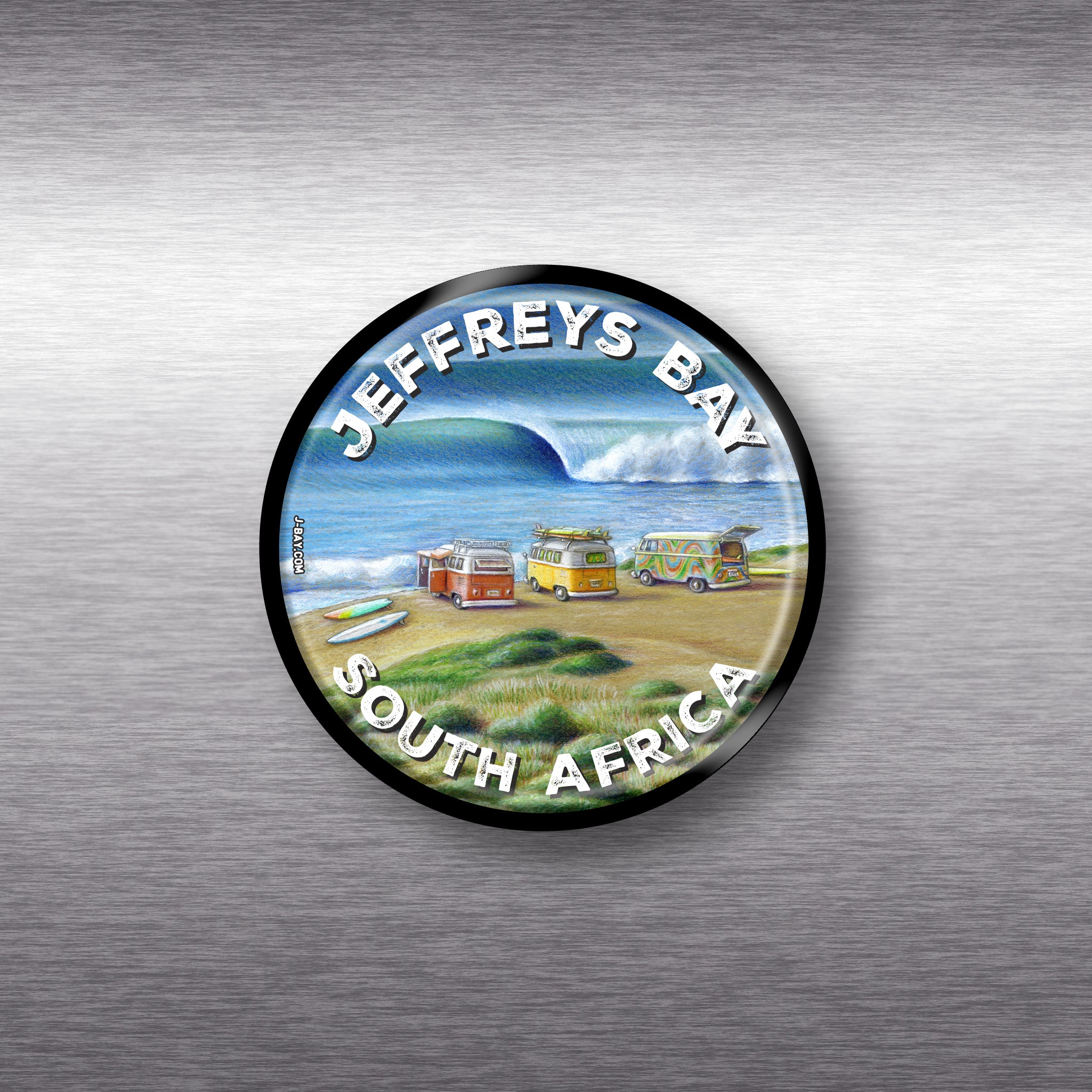 Featuring an iconic Three Kombis at Supertubes illustration by Yvonne Robinson, this 5cm magnet features a 3mm Supawood base with a non-fade art print topped with high gloss resin and strong magnet on the rear. Made by hand near here in J-Bay, this funky fridge magnet will bring a great surf vibe to your fridge.