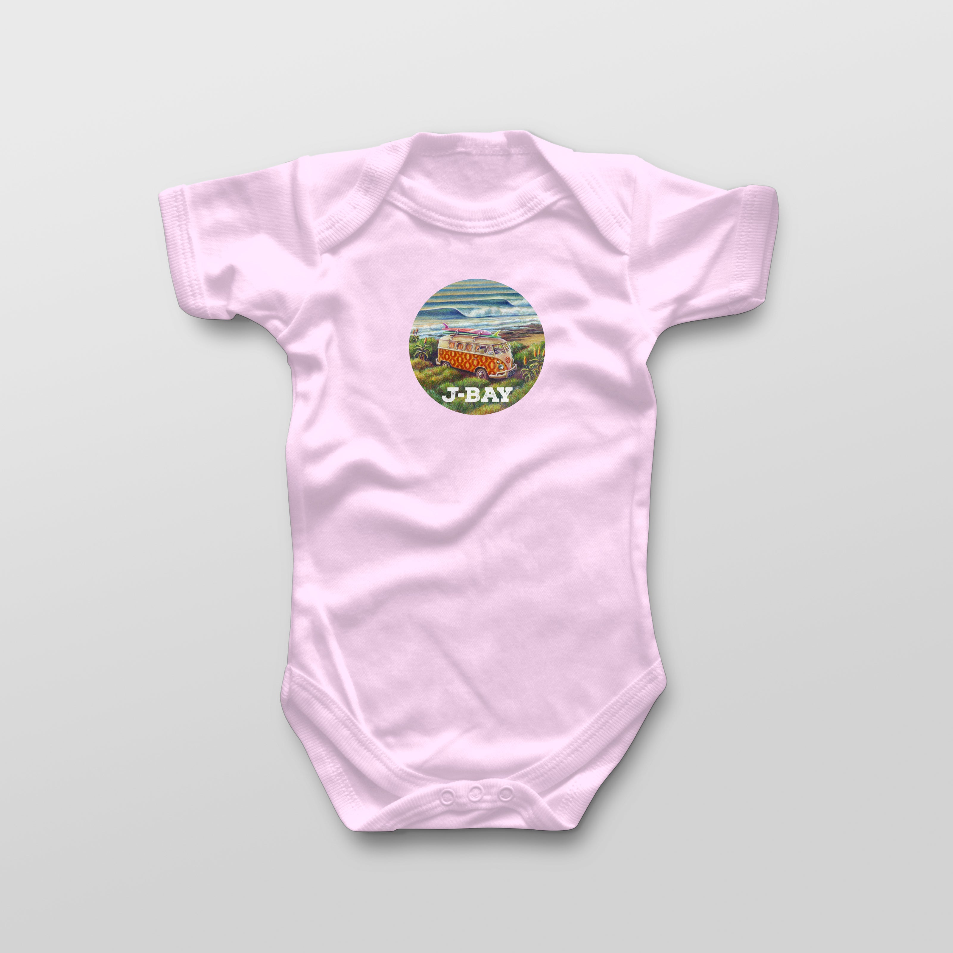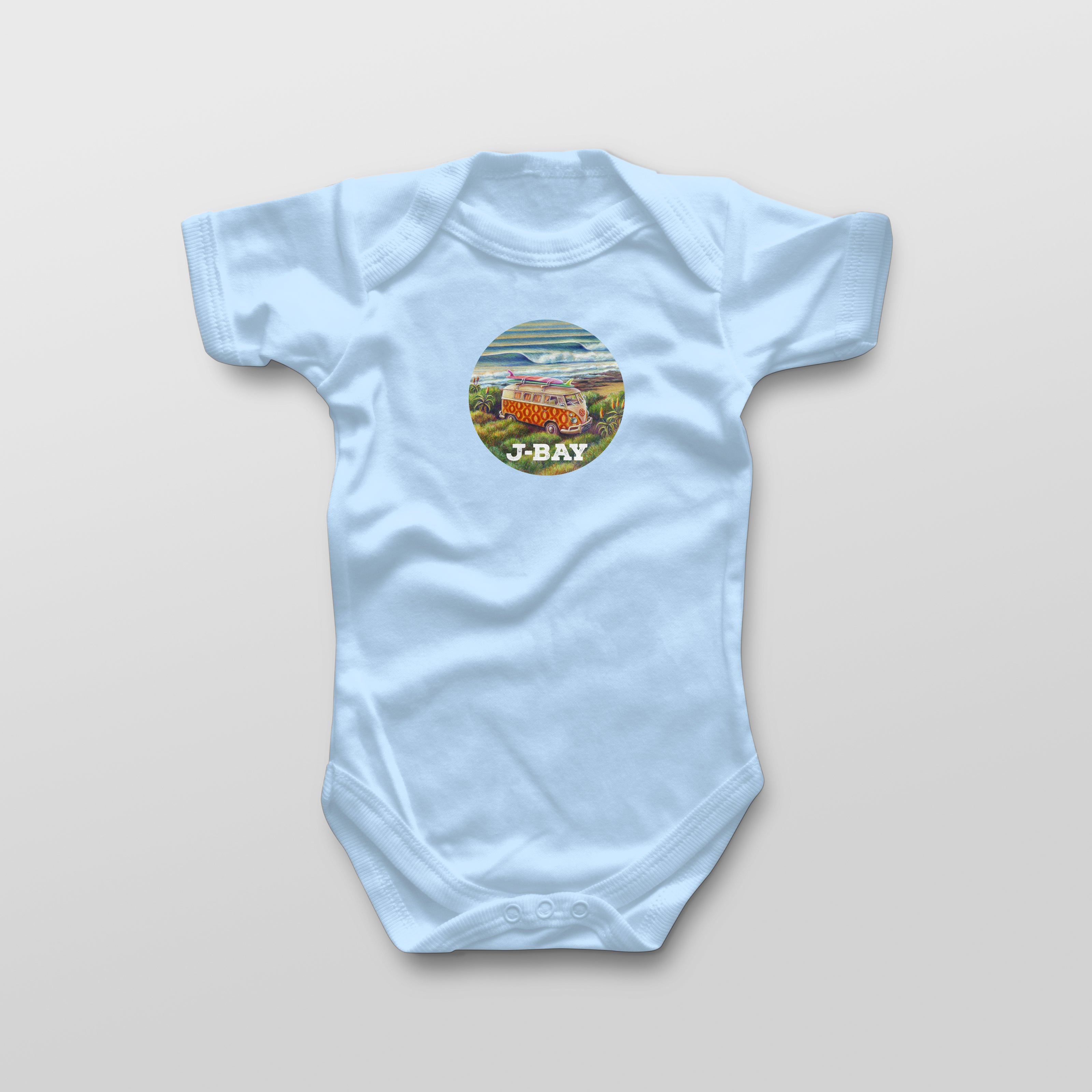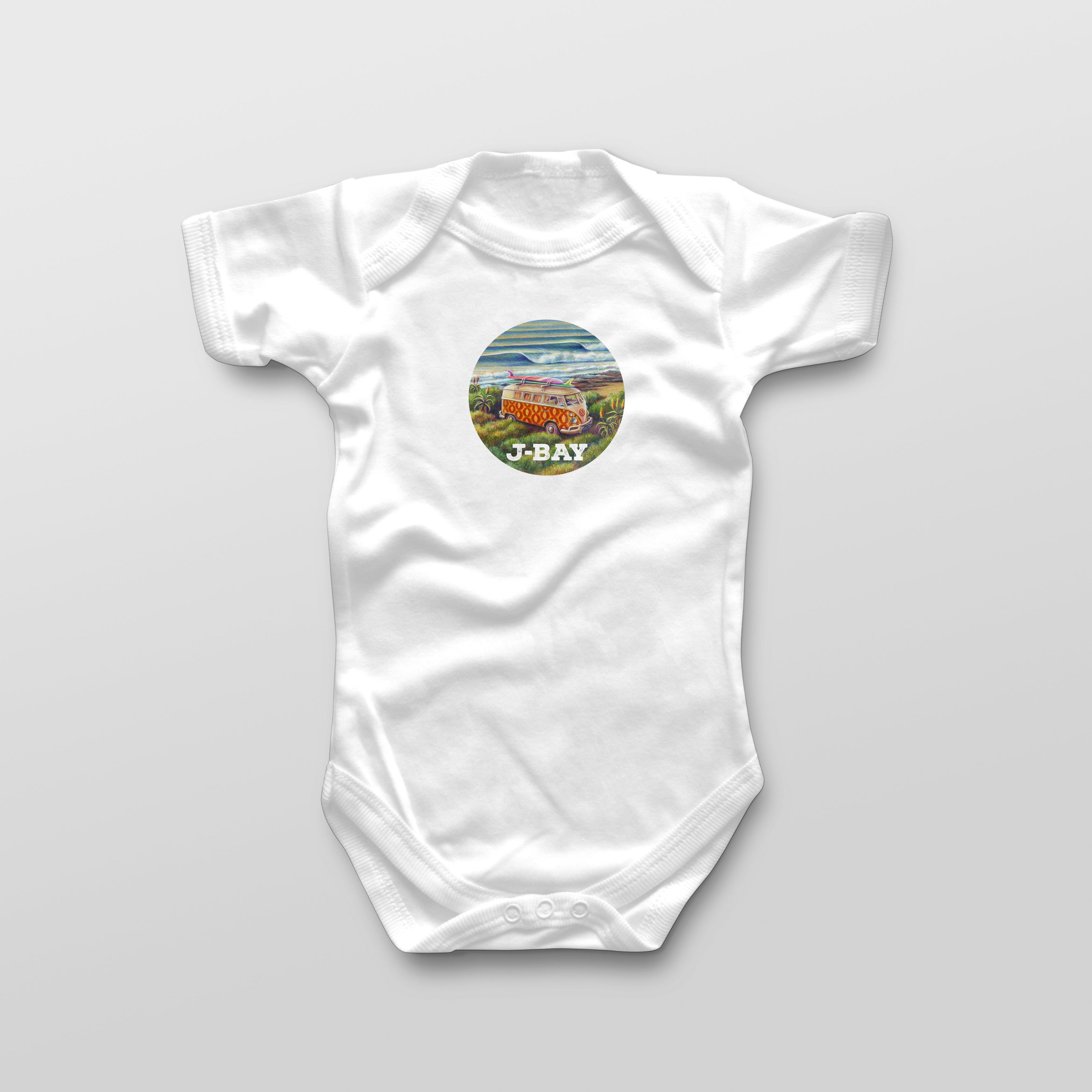 100% cotton baby bodyvests with front print featuring Yvonne Robinson surf art printed with the latest DTF technology.