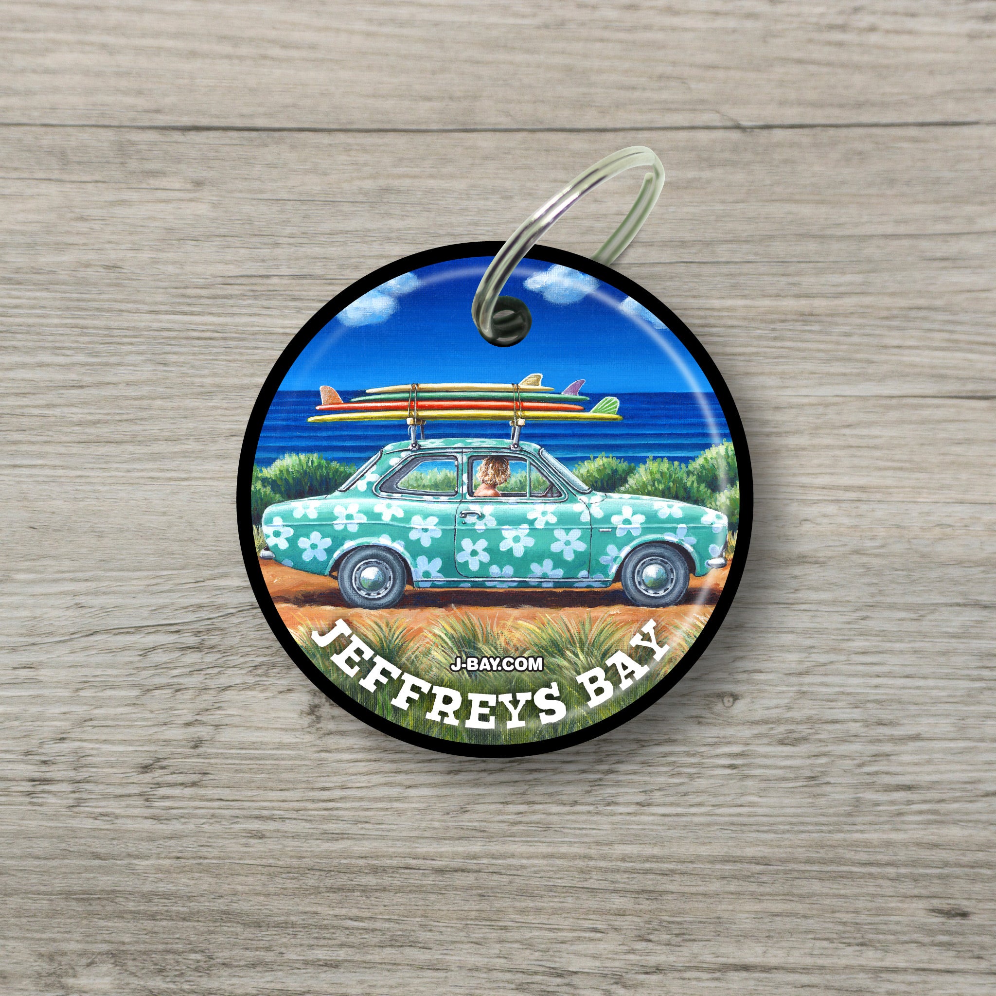 5cm round recycled wood base with surf art print on both sides featuring the Floral Ford Escort illustration by Yvonne Robinson, sealed with a resin top coat for added protection.