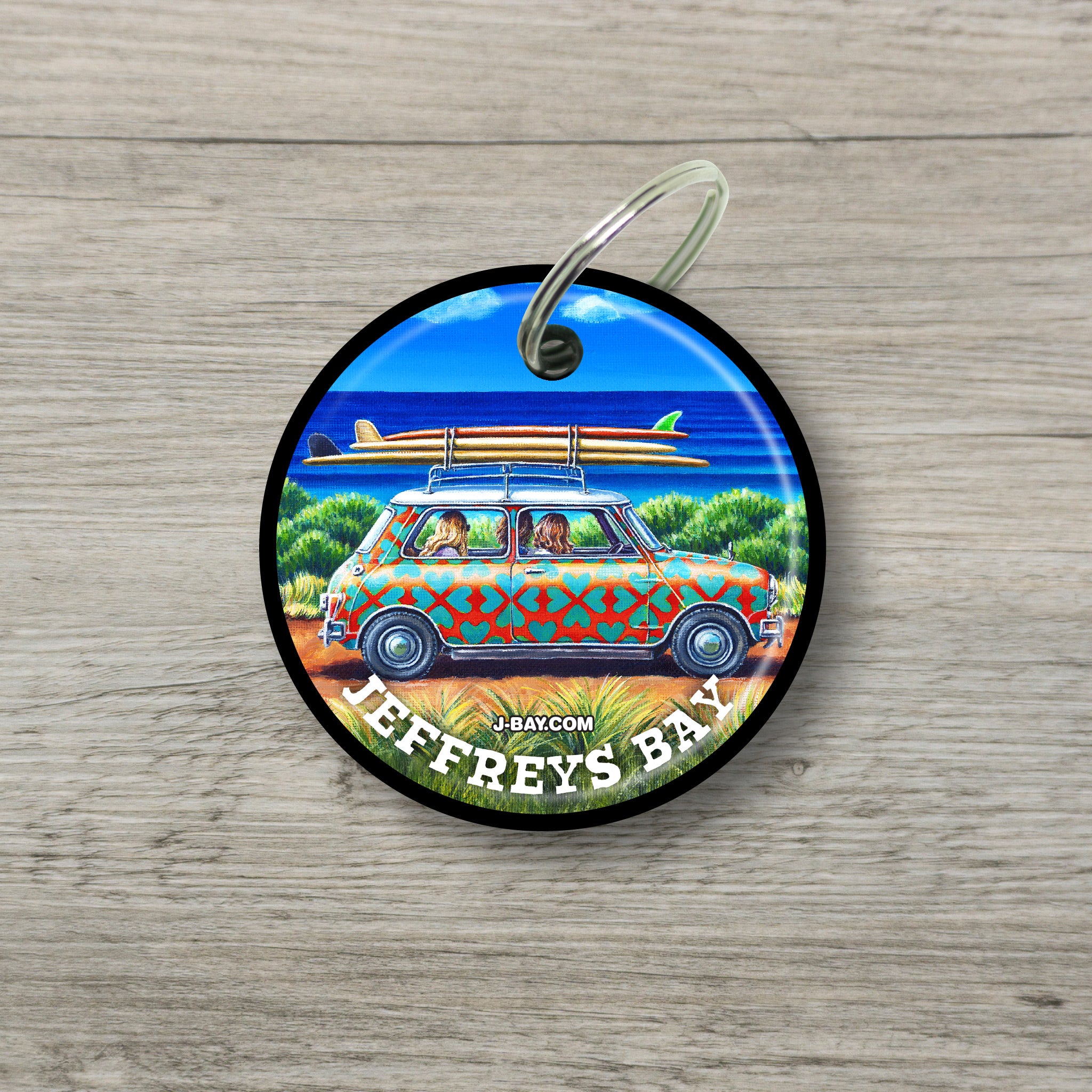 5cm round recycled wood base with surf art print on both sides featuring the Retro Mini Cooper illustration by Yvonne Robinson, sealed with a resin top coat for added protection.