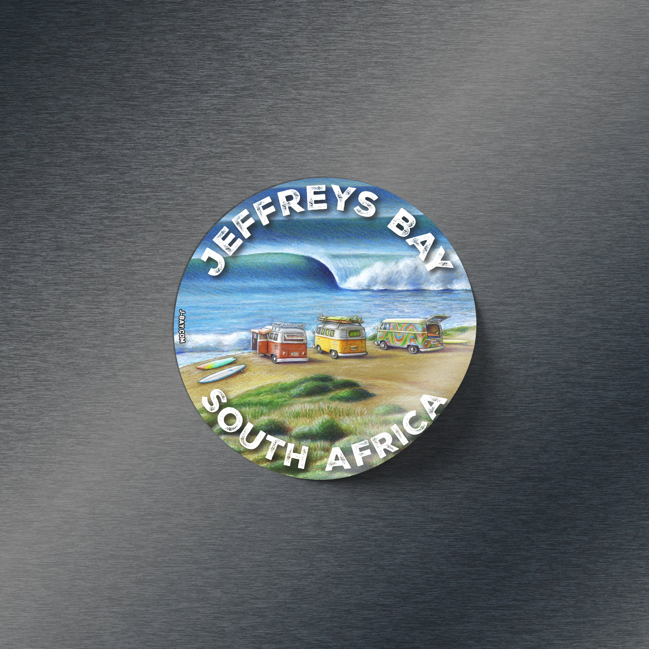 9cm round vinyl stickers featuring our unique J-Bay artworks printed in high resolution using eco-solvent non-fade inks. Waterproof inks make them perfect for use on surfboards, car license discs etc. Features easy-peel edge with die-cut backing.