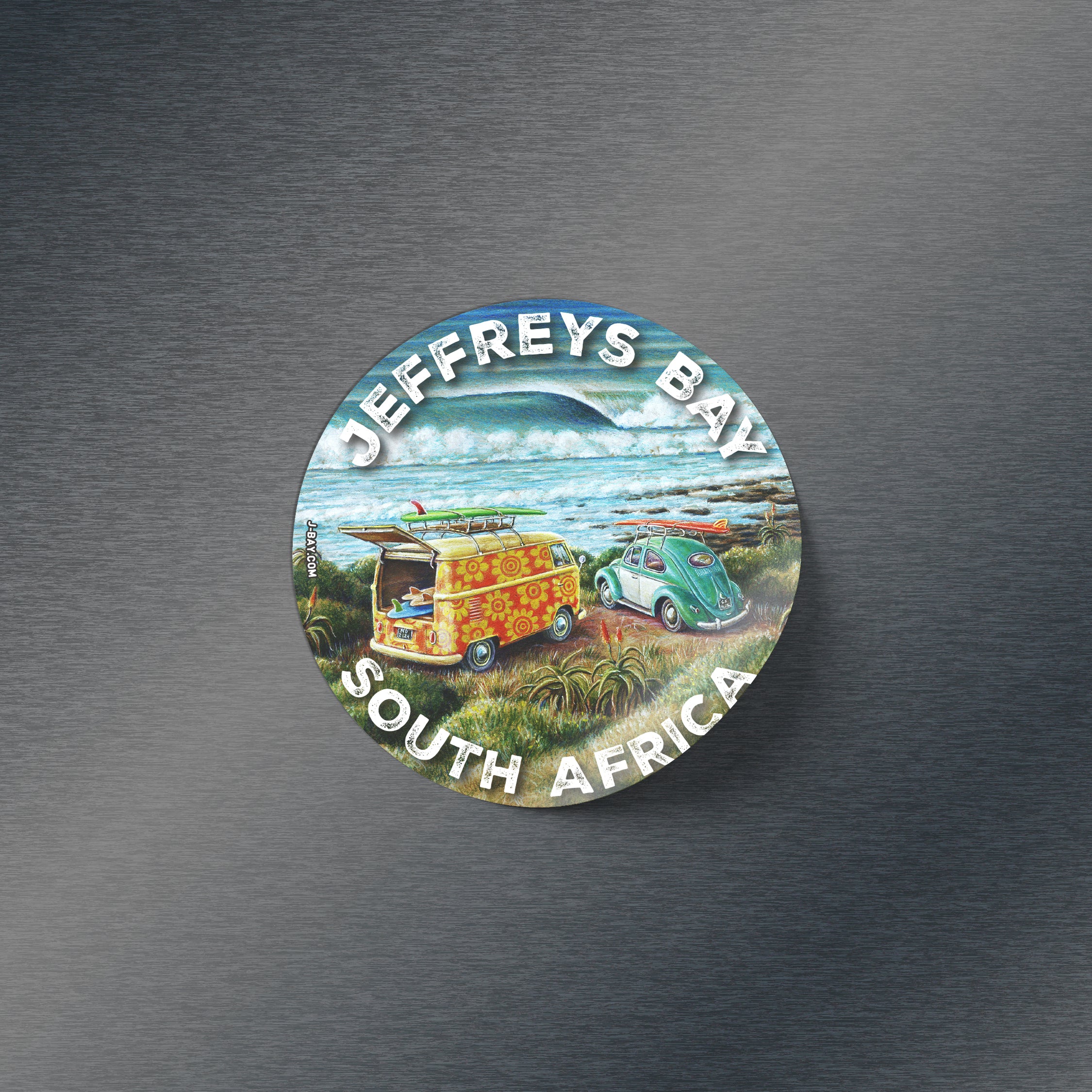 9cm round vinyl stickers featuring our unique J-Bay artworks printed in high resolution using eco-solvent non-fade inks. Waterproof inks make them perfect for use on surfboards, car license discs etc. Features easy-peel edge with die-cut backing.