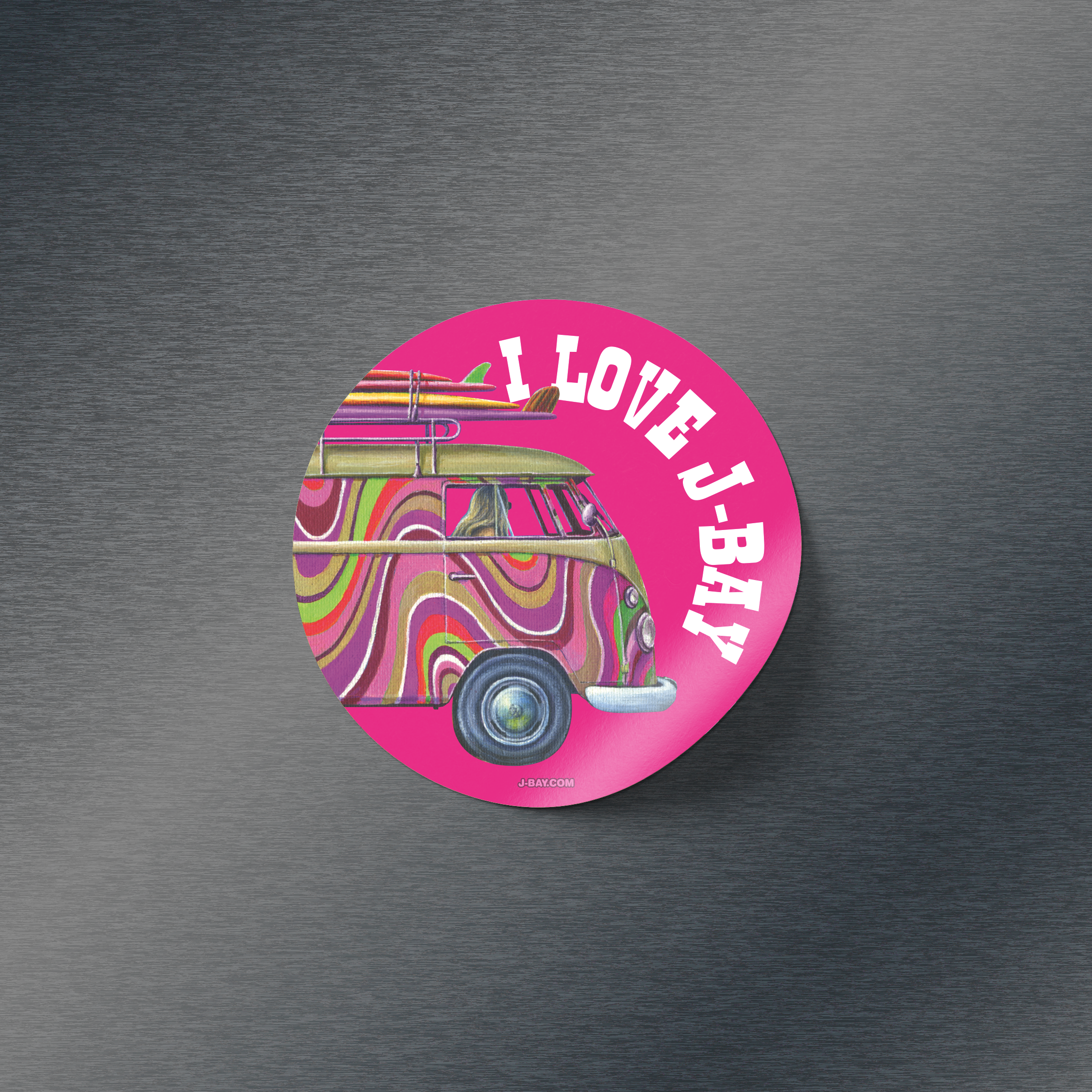 9cm round vinyl stickers featuring our unique J-Bay artworks printed in high resolution using eco-solvent non-fade inks. Waterproof inks make them perfect for use on surfboards, car license discs etc. Features easy-peel edge with die-cut backing.