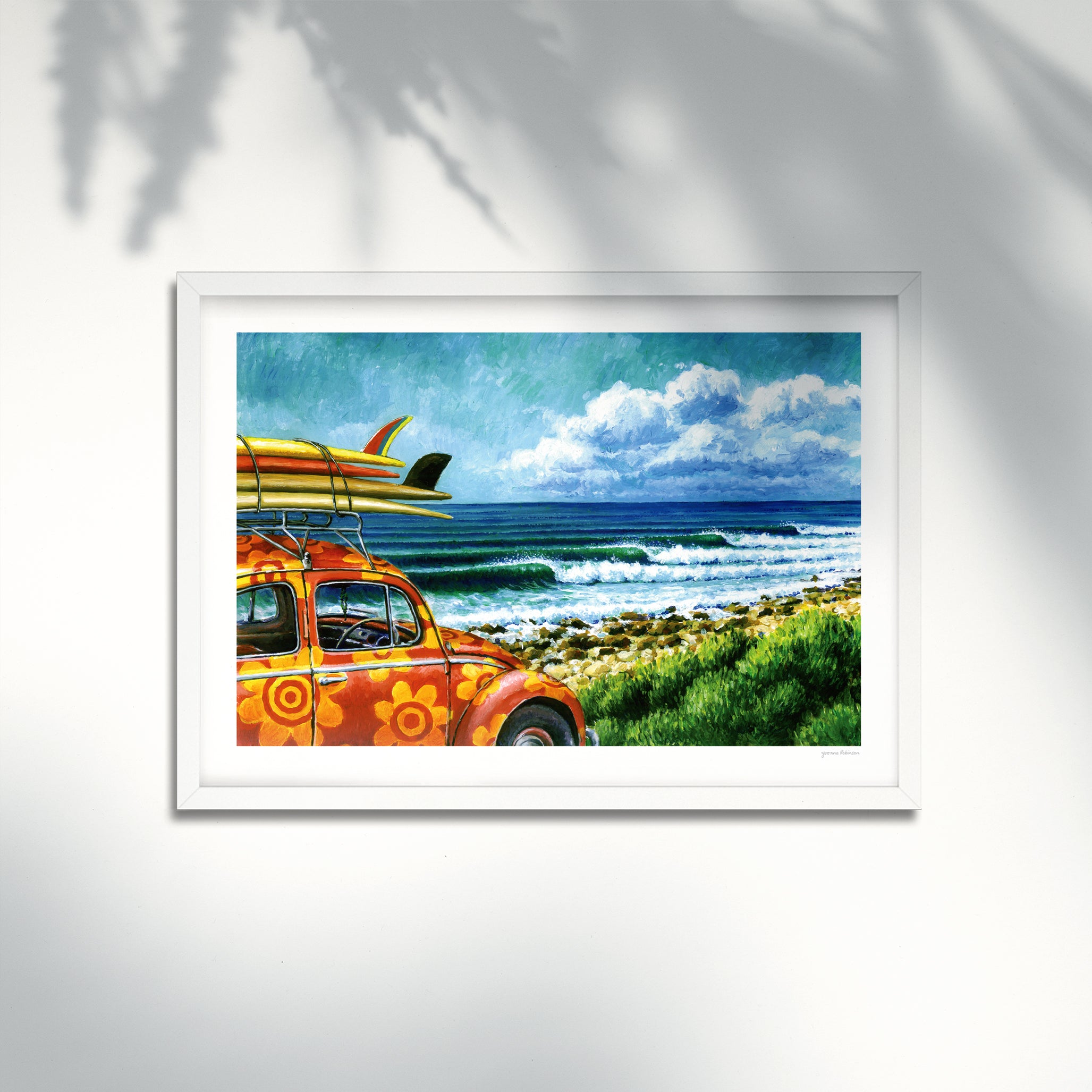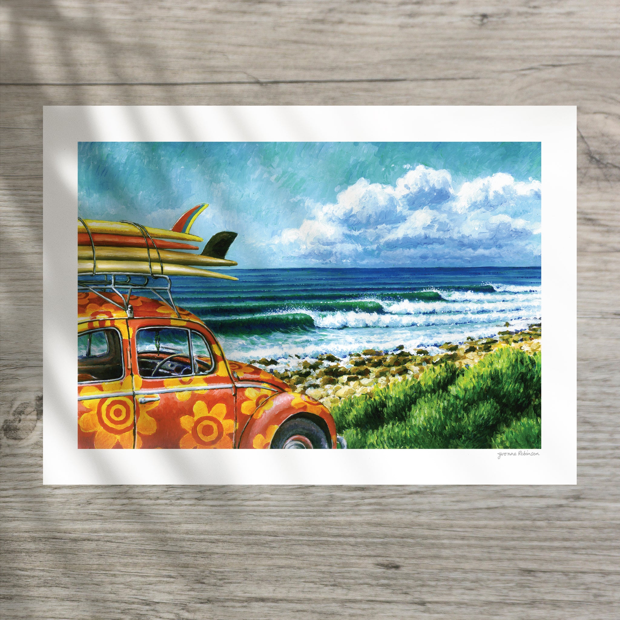 Yvonne Robinson's Beetle at Bruces illustration faithfully reproduced with archival inks on acid-free matt art paper and mounted in clear plastic on a stiff recycled card backing, ready for framing. Has a white border and is hand-signed in pencil by the artist.