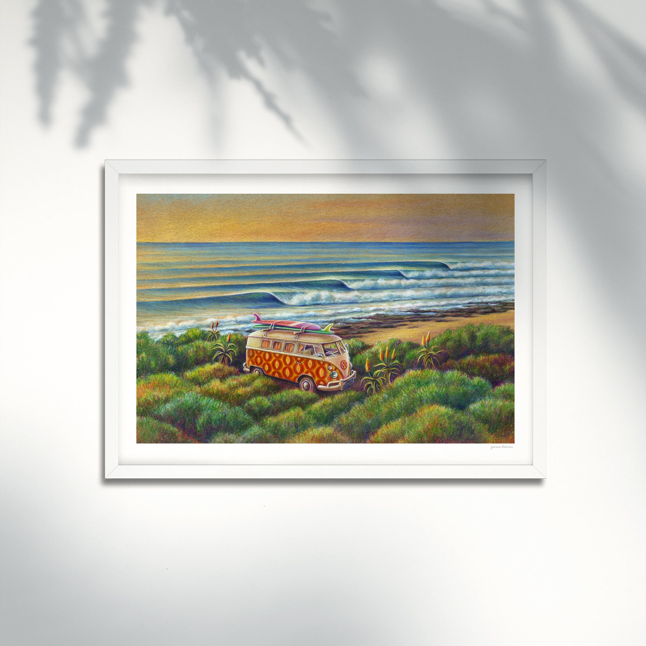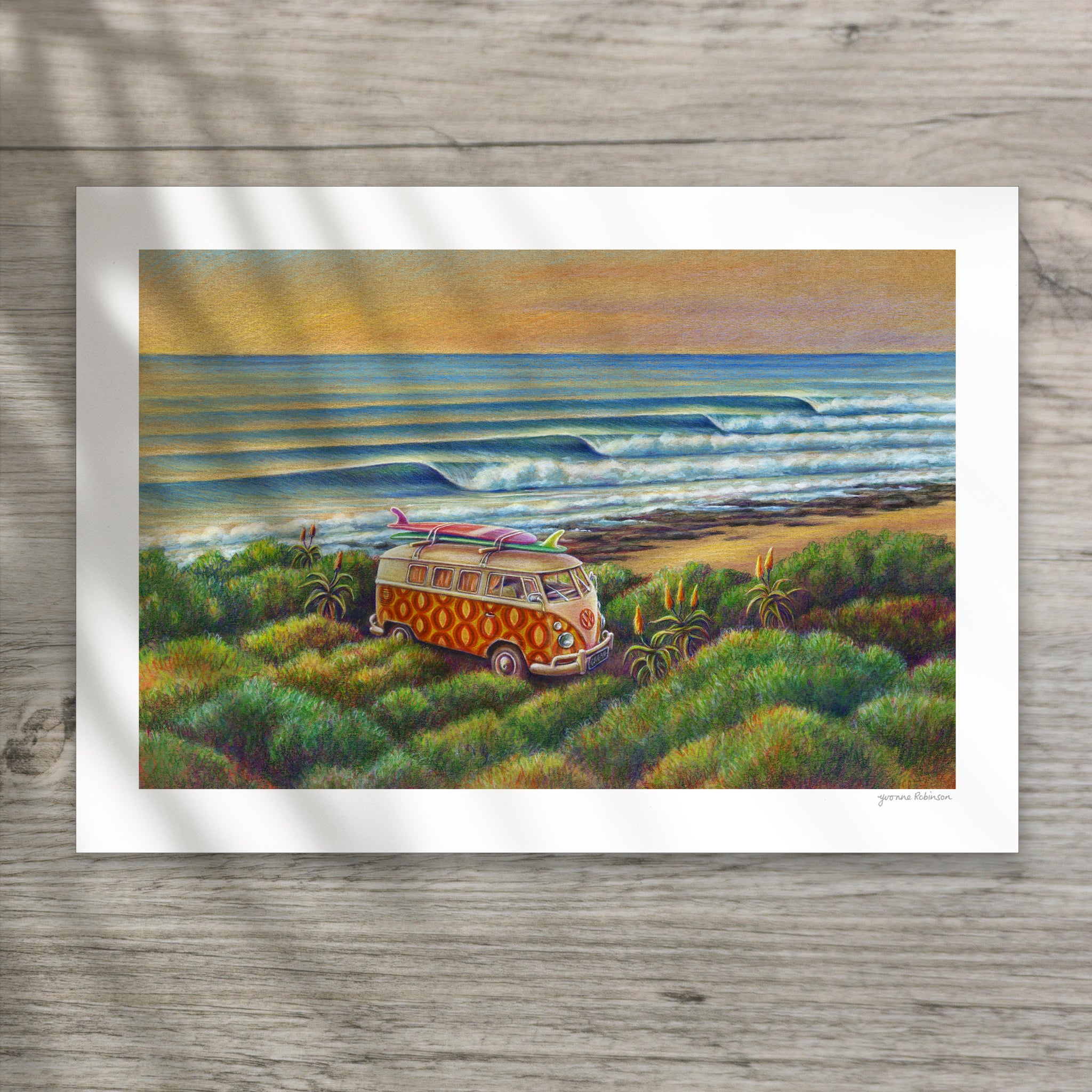 Yvonne Robinson's New Kombi at Supers illustration faithfully reproduced with archival inks on acid-free matt art paper and mounted in clear plastic on a stiff recycled card backing, ready for framing. Hand-signed in pencil by the artist.