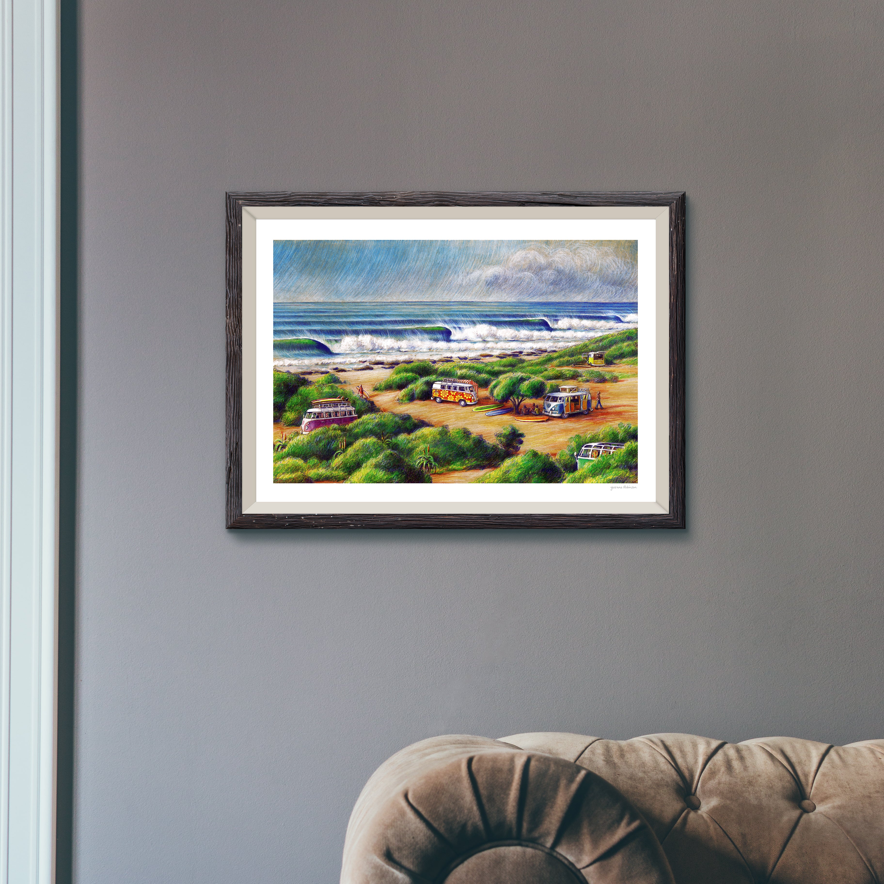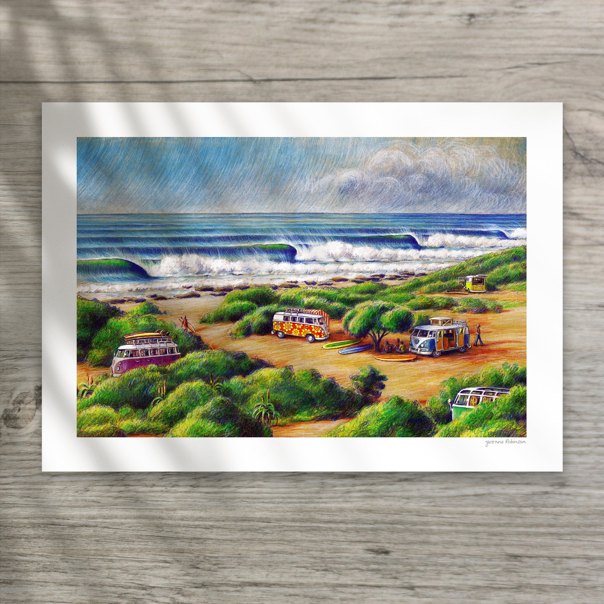 Yvonne Robinson's Kombis at Point illustration faithfully reproduced with archival inks on acid-free matt art paper and mounted in clear plastic on a stiff recycled card backing, ready for framing. Has a white border and is hand-signed in pencil by the artist.