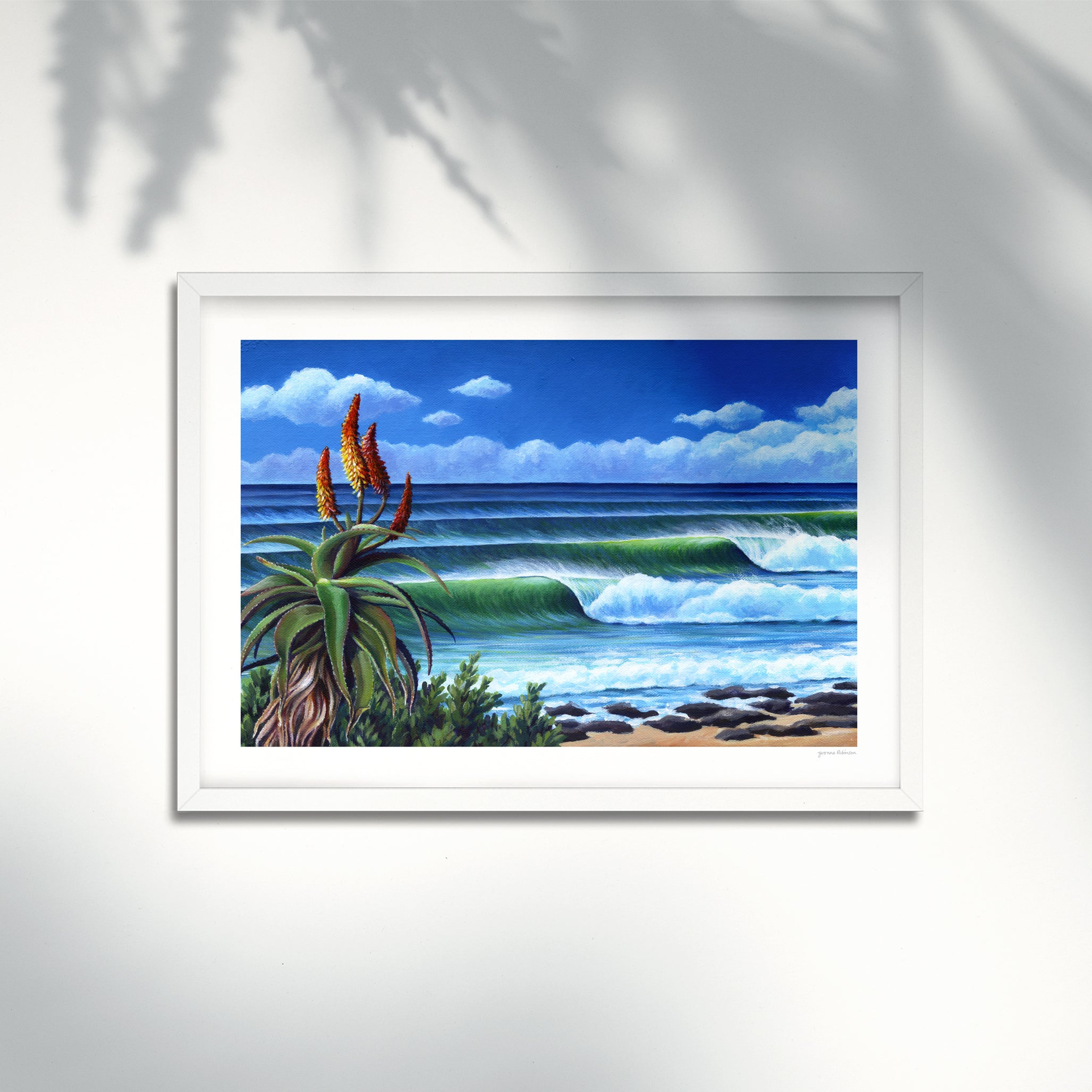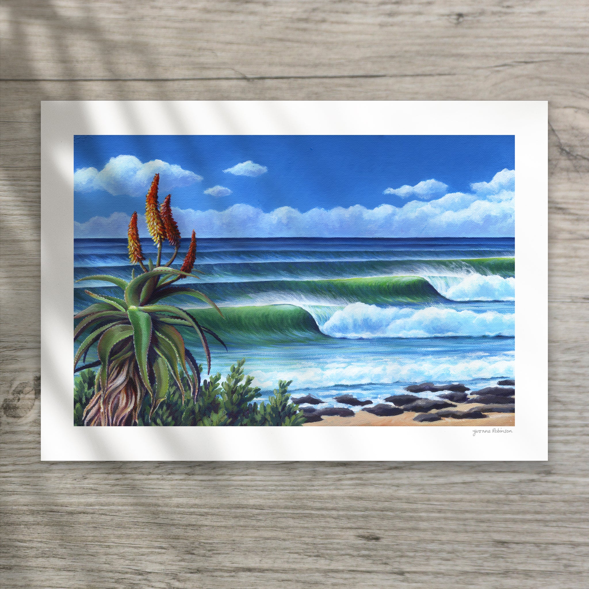 Yvonne Robinson's New Supers Aloe illustration faithfully reproduced with archival inks on acid-free matt art paper and mounted in clear plastic on a stiff recycled card backing, ready for framing. Has a white border and is hand-signed in pencil by the artist.