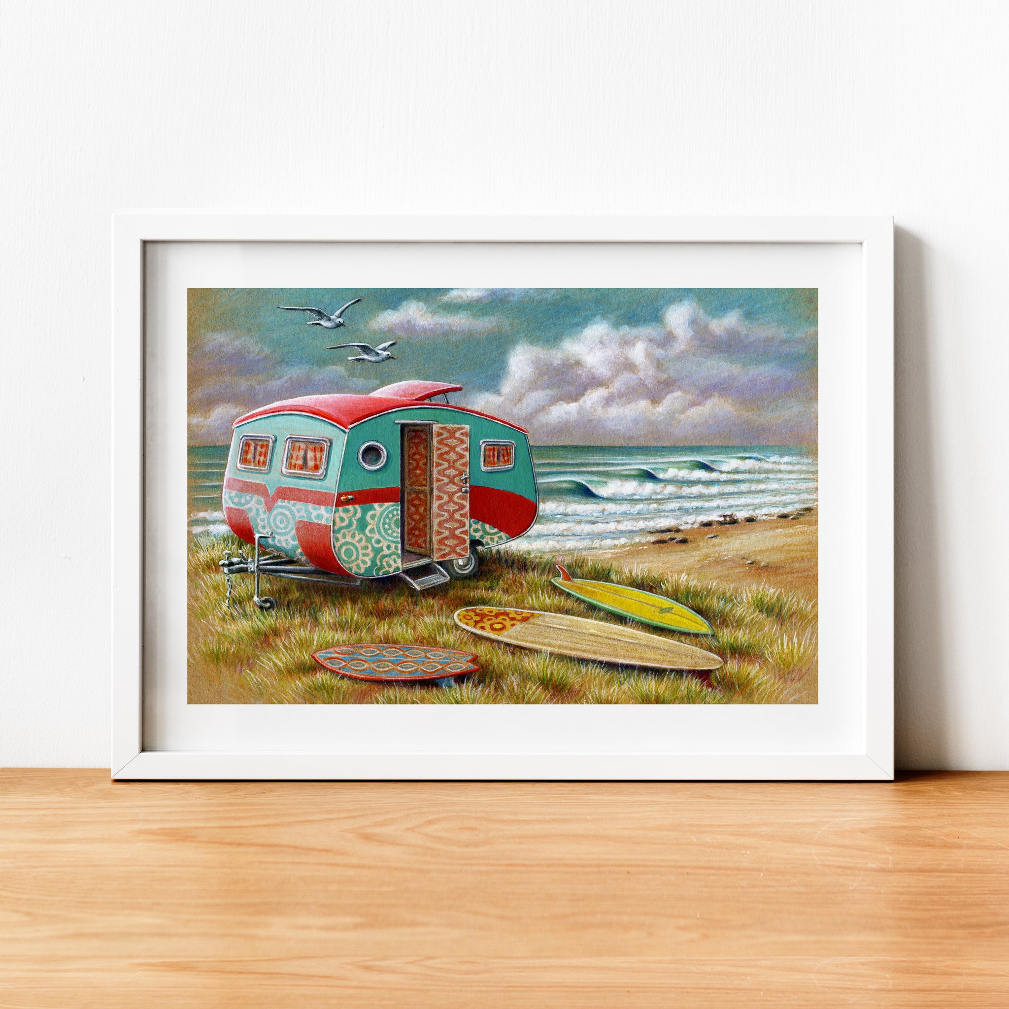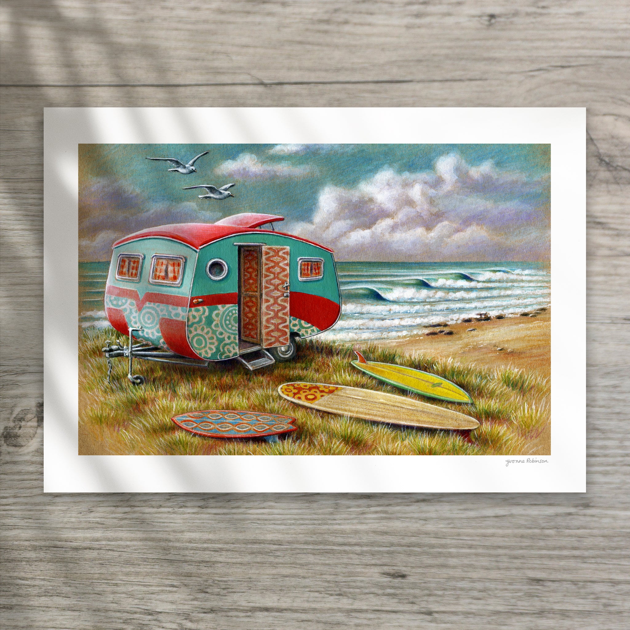 Yvonne Robinson's Red Caravan at Supers illustration faithfully reproduced with archival inks on acid-free matt art paper and mounted in clear plastic on a stiff recycled card backing, ready for framing. Has a white border and is hand-signed in pencil by the artist.
