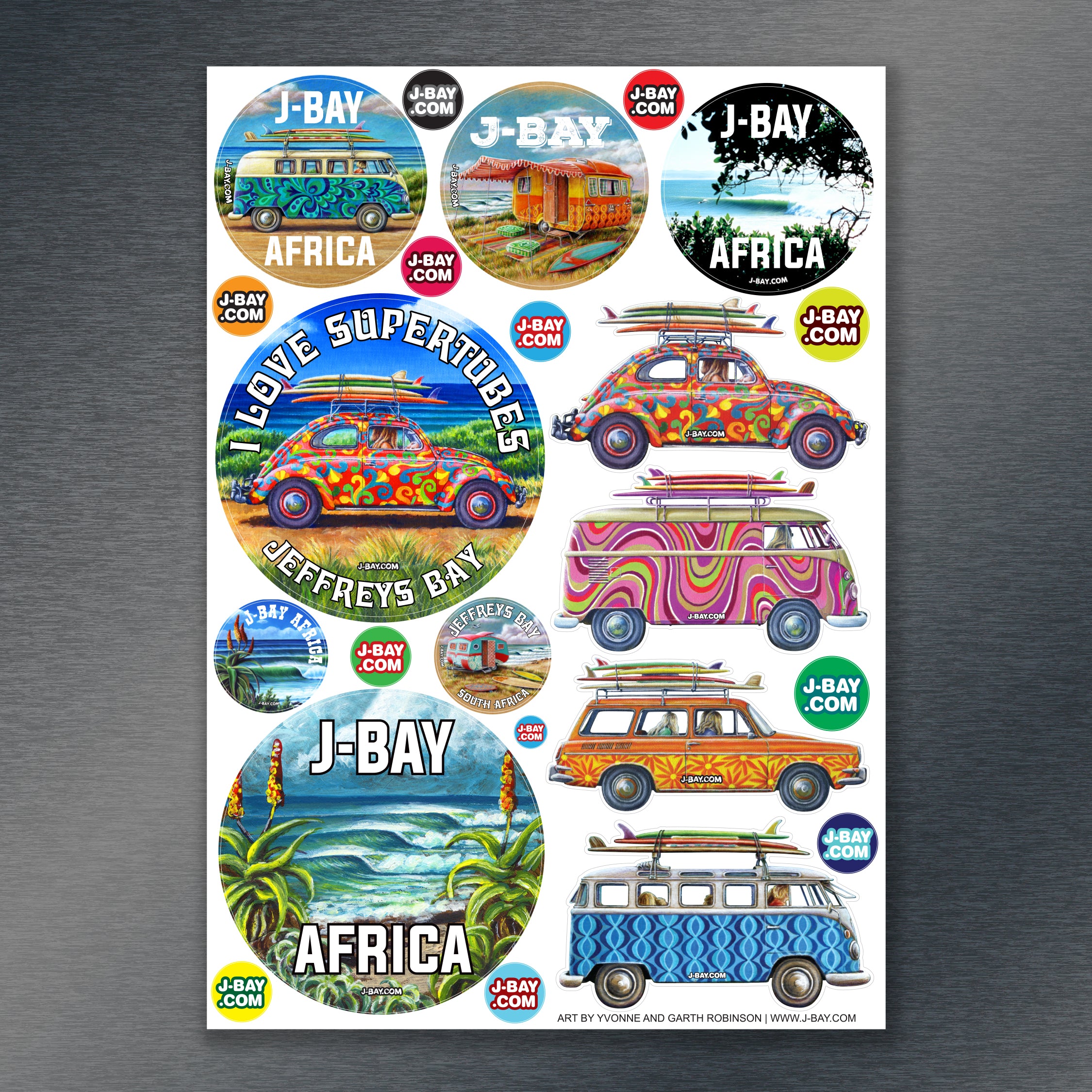9cm round vinyl stickers featuring our unique J-Bay artworks printed in high resolution using eco-solvent non-fade inks. Waterproof inks make them perfect for use on surfboards, car license discs etc. Features easy-peel edge with die-cut backing.