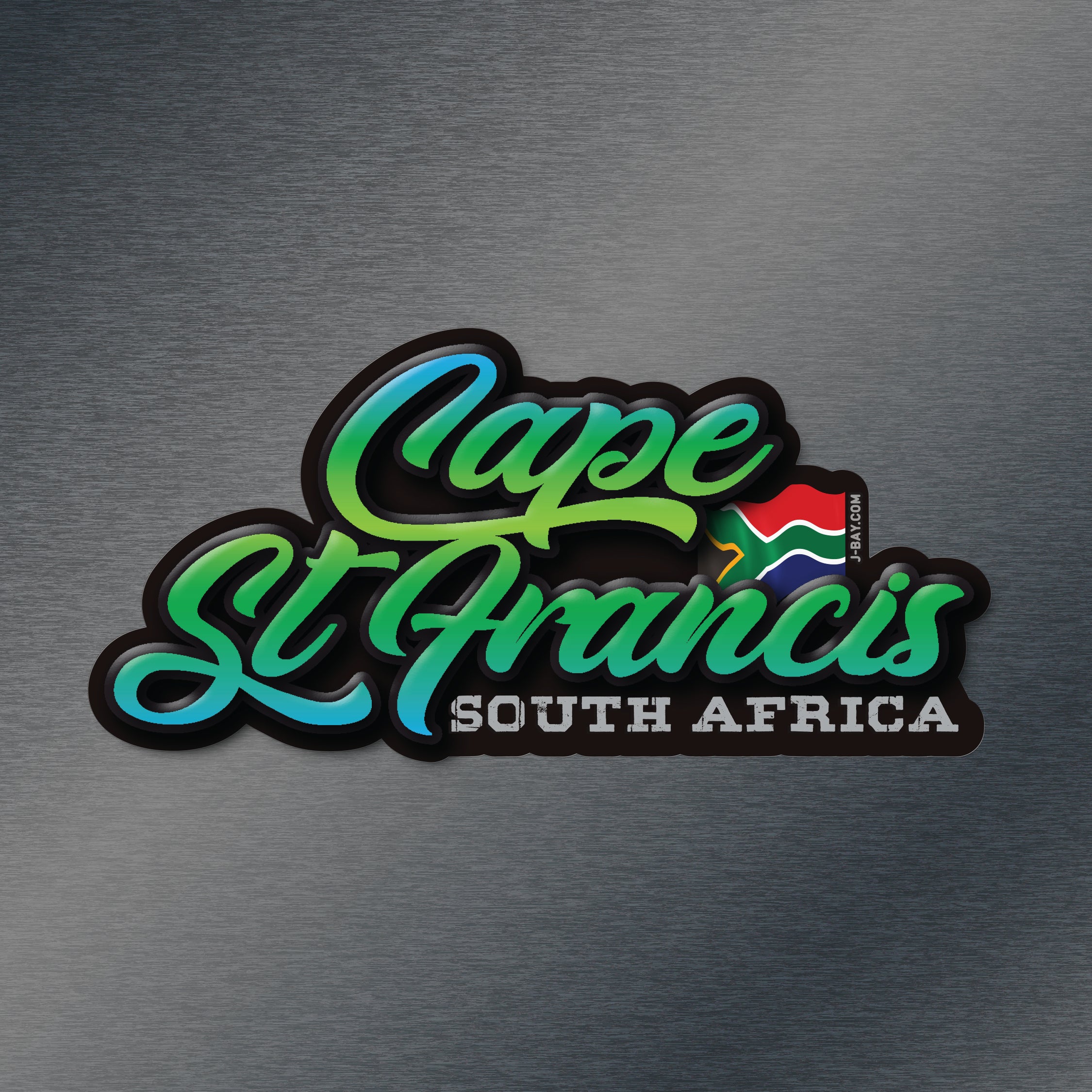 13cm x 6cm vinyl stickers featuring our our Cape St Francis aqua fade script with ZA flag printed in high resolution using eco-solvent non-fade inks. Waterproof inks make them perfect for use on surfboards, car license discs etc. Features easy-peel edge with die-cut backing.